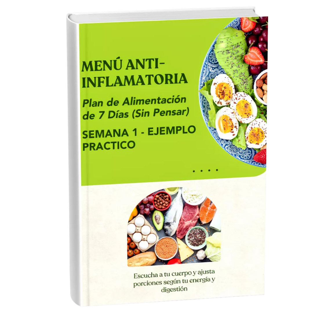 Este menú fue diseñado para eliminar la duda, el estrés y la improvisación. Durante 7 días tendrás un plan claro, práctico y equilibrado, con combinaciones antiinflamatorias listas para seguir, que te ayudan a desinflamar tu cuerpo, mejorar la digestión y recuperar energía sin complicaciones.